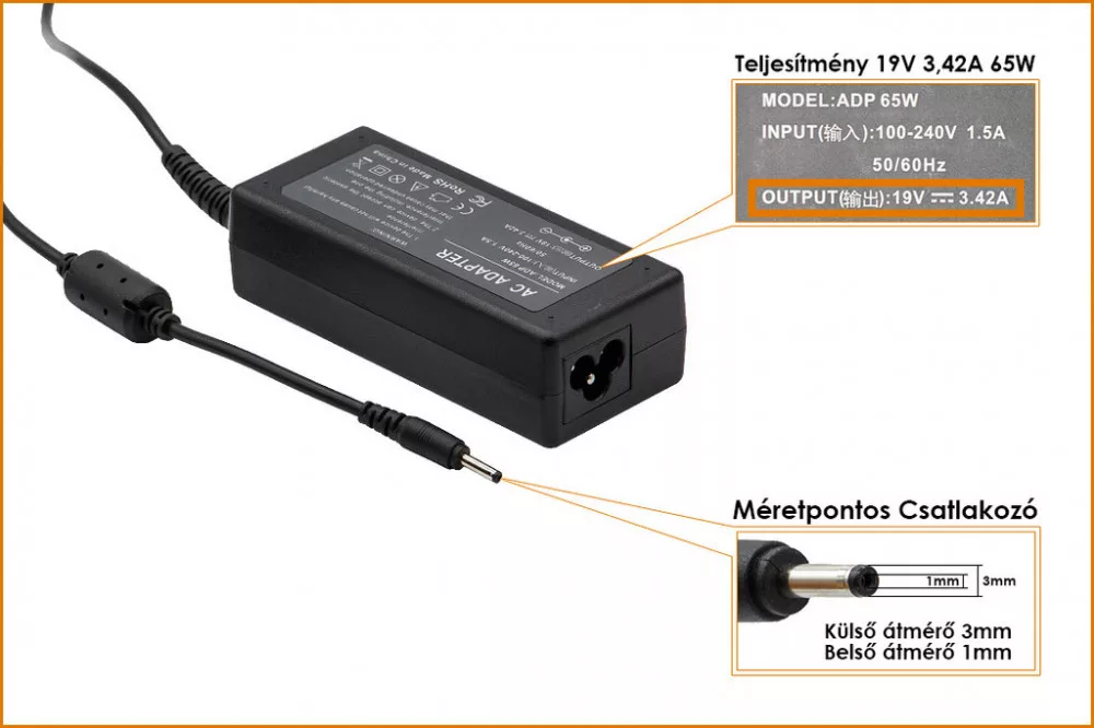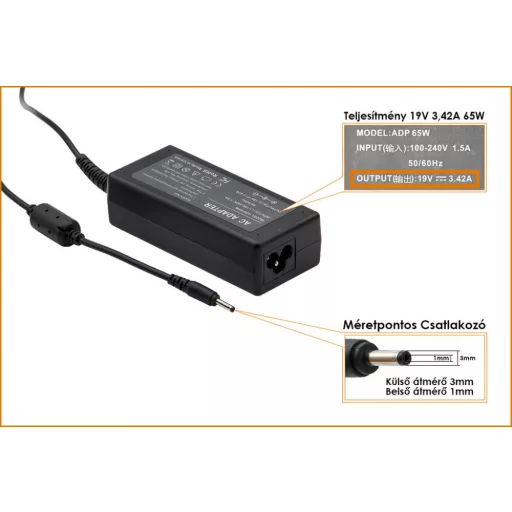 Acer 19V 3.42A (65W) 3.0x1.1mm utángyártott töltő