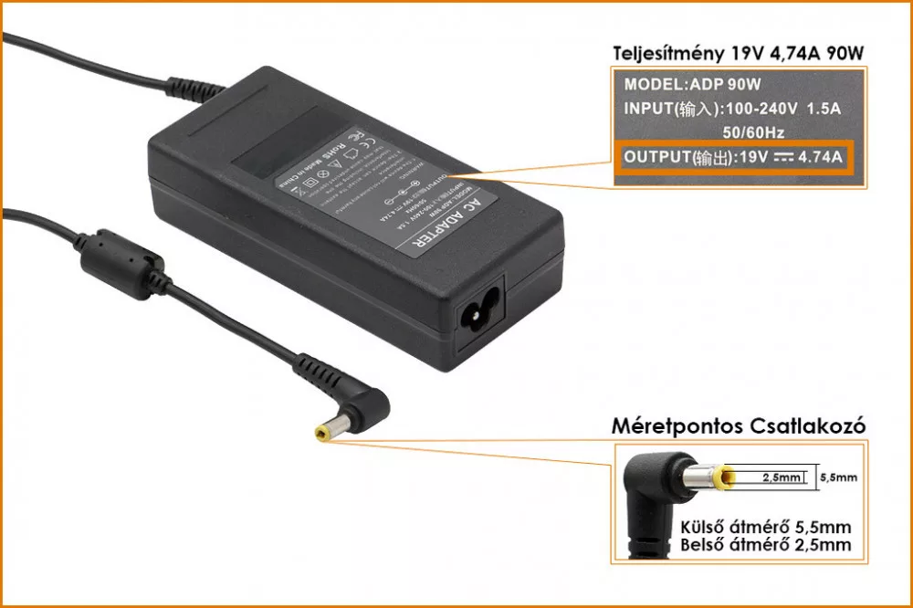 Acer 19V 4.74A (90W) 5.5x2.5mm utángyártott laptop töltő